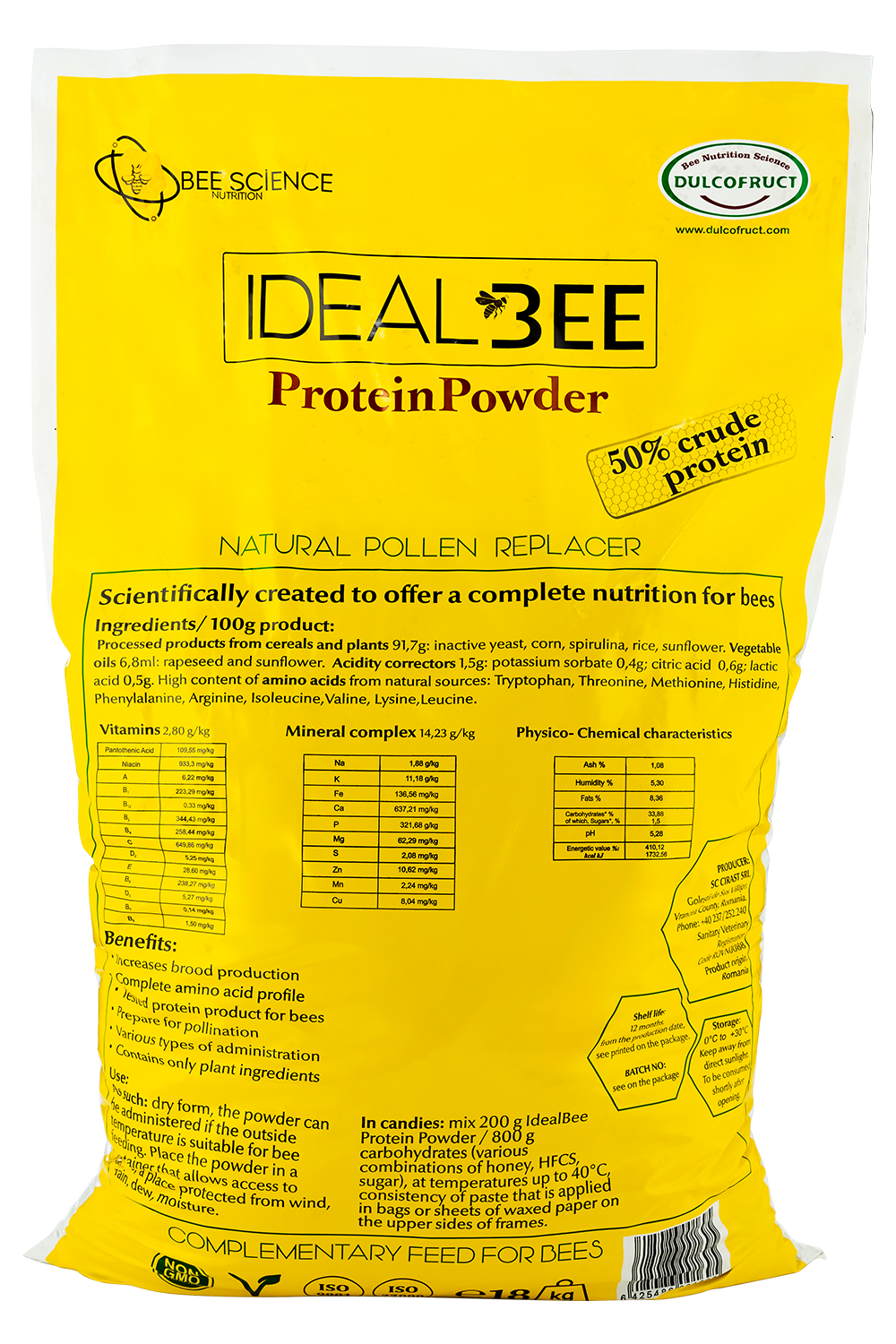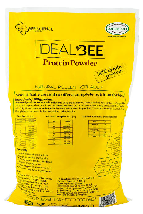 IdealBee Protein Powder este un supliment proteic destinat hrănirii coloniilor de albine, conceput pentru a înlocui sau completa aportul natural de polen. Formula sa este dezvoltată pentru a asigura o nutriție echilibrată și pentru a sprijini dezvoltarea optimă a familiei de albine.